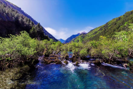 孔雀河道是從五花海出水口深谷里的一條河道。孔雀河道像是走在一副最濃烈的色彩創(chuàng)造出來(lái)的油畫(huà)里,又猶如孔雀羽一樣,將塵世間最美麗的藍(lán)和綠都融合在一起。