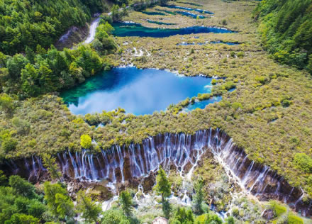 樹(shù)正群海海拔2187—2280米。其地形是在河谷迭加泥石流堆積物基礎(chǔ)上,再經(jīng)鈣華沉積,形成大小19個(gè)湖泊,順著溝谷層層迭迭。該處森林、湖泊、小瀑布相錯(cuò)相連,呈現(xiàn)“樹(shù)在水中生,水在林間流,人在畫(huà)中游”的奇特景觀。