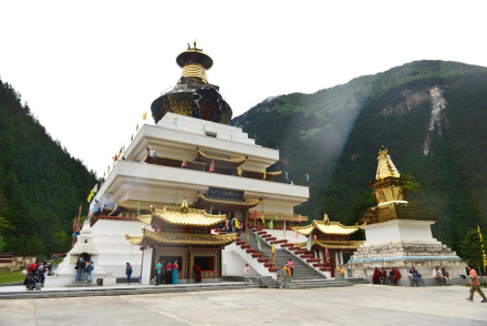 目前,九寨溝景區(qū)僅保留了樹(shù)正寨、荷葉寨、則查洼寨這三個(gè)村寨,善良淳樸的他們,用微笑迎接著前來(lái)九寨溝的每一個(gè)人。而在這些村寨中,最壯觀的莫過(guò)于樹(shù)正寨前的“九寶蓮花菩提塔”,七彩經(jīng)幡隨風(fēng)飄蕩,圣潔的白塔在陽(yáng)光下仿若閃著光,這里也是眾多游客到來(lái)時(shí),都會(huì)雙手合十,輕聲祭拜的地方。
