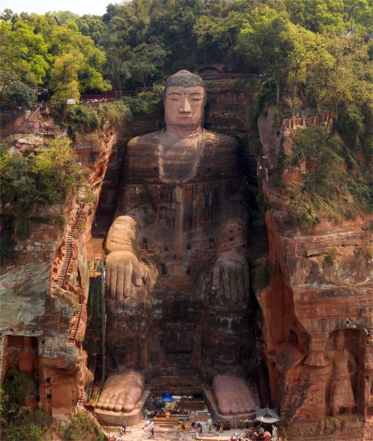 樂山大佛,又名凌云大佛,全稱為“嘉州凌云寺大彌勒石像”,位于四川省樂山市南岷江東岸凌云寺側,瀕大渡河、青衣江和岷江三江匯流處。大佛為彌勒佛坐像,通高71米,是中國最大的一尊摩崖石刻造像。樂山大佛開鑿于唐代開元元年(713年),完成于貞元十九年(803年),歷時約九十年。
