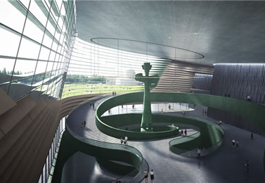 三星堆新館還包含地下一層。觀眾通過螺旋樓梯進入負一樓以后,這里設(shè)計了游玩兒童樂園和學(xué)術(shù)報告廳。未來,孩子們可以在這里通過游戲的方式愛上考古和文物,觀眾也可以在這里聆聽到考古大咖們的學(xué)術(shù)報告。