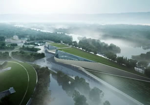 三星堆新館共三個堆體,東側(cè)兩個堆體為展陳空間,西側(cè)一個堆體為后勤庫區(qū)!毙吗^屋頂采用斜坡覆土形態(tài),建筑消隱融入環(huán)境,與一號館形體左右呼應(yīng);建筑形成三個沿中軸排列的覆土堆體,也寓意“堆列三星”。