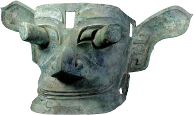 商銅縱目面具:此文物為商代的青銅器,面具呈方型,倒八字形刀眉,眉尖上挑,雙眼斜長,眼球極度夸張;耳尖部呈桃尖狀;鷹鉤鼻,口角深長上揚,似微露舌尖,作神秘微笑狀;下頜前伸;額部正中有一方孔。現(xiàn)收藏于三星堆博物館。