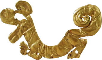 商金箔虎形飾:此文物為商代的金器,系用金箔捶拓成形,遍體壓印“目”字形的虎斑紋;㈩^昂起,張口作咆哮狀,眼部鏤空,前足伸,后足蹲,尾上卷,呈奔跑狀。金虎呈半圓形,F(xiàn)收藏于三星堆博物館。