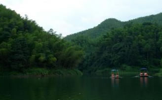 湖中有兩座不同的原形小島。湖水碧綠清澈,四周翠竹掩映,綠草如茵,附近有梅坪、古佛洞、涼風洞、照妖鏡、七疊石等古跡。當太陽起落時,滿湖金色,萬道霞光,絢麗多彩。湖上可蕩舟劃筏,湖邊亭閣,也可品茗小酌。夏秋之夜,山巒沉郁而秀朗,清風徐來,漣漪翩翩,湖邊納涼閑話,別有情趣。