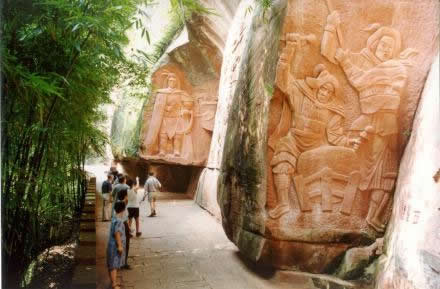 蜀南竹海景區(qū)內竹林、絕壁、寺廟、古寨構成的文化長廊景觀,綿延20余公里,是天人合一的曠世奇觀。在千仞絕壁之上,仙寓硐、天寶寨、三十六計摩崖石刻等,是國內罕見的佛道儒共融的中國丹霞絕壁文化長廊景觀,是大自然的鬼斧神工和古今匠人智慧的結晶的杰作。