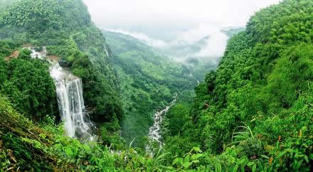 七彩飛瀑又名落魂臺。《江安縣志》載:“萬嶺箐南北飛瀑,殆似廬山”。不擇地而出的泉水,使得深邃幽深的竹海充滿靈氣,山巖跌宕處,每每作了懸泉飛瀑。山間數(shù)十條姿態(tài)各異的瀑布中,最為壯觀的,當數(shù)七彩飛瀑。七彩飛瀑處在石鼓山和石鑼山之間的葫蘆谷中,從深林里流出的水潦河,在回龍橋下分為四級瀉下懸崖,落差近200米,蔚為壯觀。瀑布上頭,還有石龍過江、孟獲墳、古較場等景點。一湖碧水映藍天翠竹;湖水的寧靜,與瀑布的飛動相互映照。