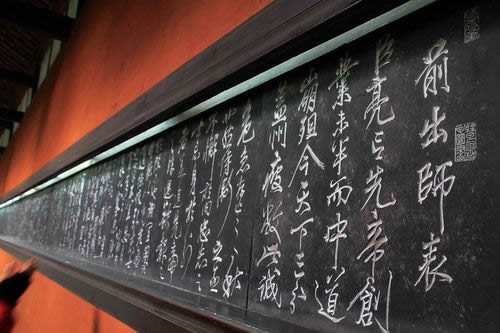 諸葛亮殿的東西廂是書屋、客室,鐘樓、鼓樓峙立大殿二角。諸葛亮殿內(nèi)供祀著諸葛亮的貼金泥塑坐像,左側(cè)是諸葛亮之子諸葛瞻,右側(cè)是諸葛亮的孫子諸葛尚。塑像前有銅鼓三面,鑄于公元六世紀(jì)之前,傳說是南征夷蠻時所用。大殿后壁嵌有許多石刻,東壁是當(dāng)代書法家沈尹默書寫的諸葛亮 《隆中對》 ,表達(dá)的是“三顧頻繁天下計,兩朝開濟(jì)老臣心”的壯志雄心;西壁則是宋代名將、“精忠報國”的民族英雄岳飛所書的諸葛亮 《出師表》 ,“鞠躬盡瘁,死而后已”名句傳誦千古,忠誠執(zhí)著的浩然正氣氣貫長虹。殿內(nèi)外匾對甚多,都是對諸葛亮的謳歌和追思。