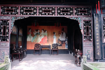 工字廳的正前方有一臺(tái)階。臺(tái)階上方是戲臺(tái)。臺(tái)前立柱上有一副對(duì)聯(lián):“移影換形儼然君臣父子,假哭真笑表達(dá)離合悲歡”,構(gòu)思精妙,立意深刻,無聲地向人昭示:這里是戲劇的天地。臺(tái)口左右華板上雕刻著《白蛇傳》中的“船舟借傘”和《西廂記中》的“鶯鶯聽琴”。人物形神畢現(xiàn),栩栩如生。臺(tái)前的落地罩精致絕倫,有關(guān)專家學(xué)者稱贊其“集中國民間傳統(tǒng)木雕之精華”,自是當(dāng)之無愧,其雕刻內(nèi)容,有歷史故事,如“黃道州發(fā)兵抗清”;有戲劇故事,如“別窯從軍”;有的取材于唐詩,如“尋隱者不遇”、“清明詩”等,有民間傳說,如“羊有跪乳之恩、烏有反哺之義”;有的采用諧音、象征手法表現(xiàn)美好的意愿的傳統(tǒng)圖案,如“掛印封候”、“富貴白頭”、“路路通順”等。