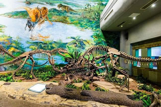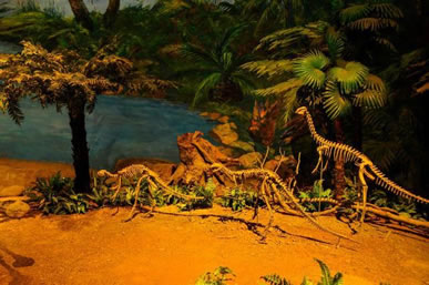 自自貢恐龍博物館的現(xiàn)有基本陳列“侏羅紀(jì)恐龍世界”,按照“恐龍世界——恐龍遺址——恐龍時代的動植物——珍品廳——恐龍再現(xiàn)”順序展開,吸收現(xiàn)代陳列理念,采用場景式展示、擬人化組合,輔之以聲、光、電及多媒體等展示手段,展開了一幅蔚為壯觀、神奇瑰麗史前畫卷,再現(xiàn)了由恐龍及許多早已消失的物種構(gòu)成的神秘多姿的侏羅紀(jì)時代。同時,還突出展示了博物館的精華—化石埋藏現(xiàn)場,給人以強(qiáng)烈的視覺沖擊和心靈震撼,充分體現(xiàn)了專業(yè)博物館與遺址博物館的雙重特色。