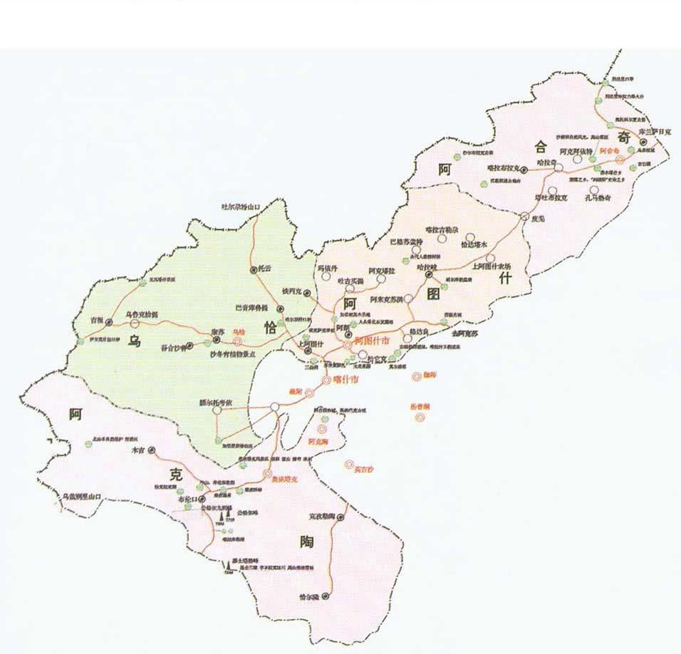阿圖什市 面積15500平方千米,人口29.09萬,政府駐阿圖什市帕米爾路東3院,下轄3個(gè)街道、3個(gè)鎮(zhèn)、4個(gè)鄉(xiāng)