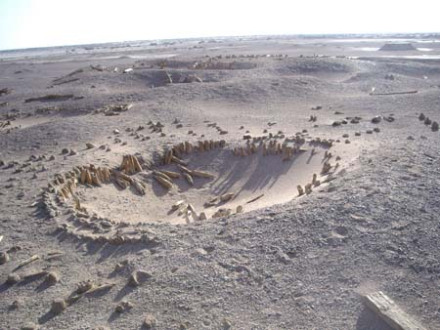 位于太陽(yáng)墓地西側(cè),在古河道北岸的一片臺(tái)地上,有成片的株距相等、行距相同、樹(shù)干尺余粗的枯死的胡楊林。這成排成行的枯樹(shù),帶有明顯的人工營(yíng)造的特征。