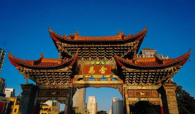 金馬碧雞坊,位于昆明市中軸線的三市街與金碧路交叉口,高12米、寬18米。東坊臨金馬山,名金馬坊;西坊靠碧雞山,名碧雞坊。該坊雕梁畫(huà)棟,始建于明朝宣德年間。