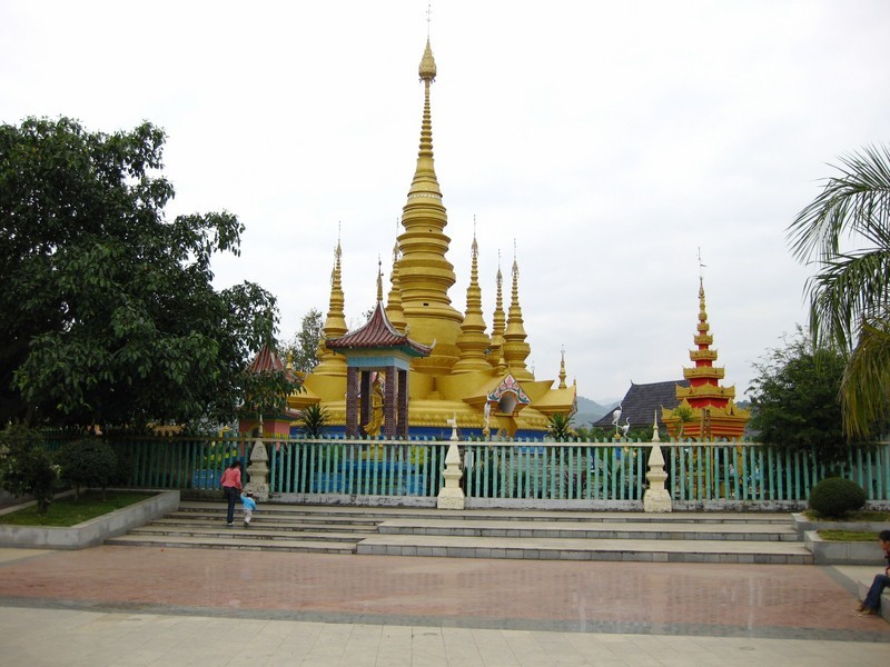 孟連金塔位于南壘河畔,建成于1997年,由8個小塔環(huán)抱一個主塔構成,主塔高31.68米。