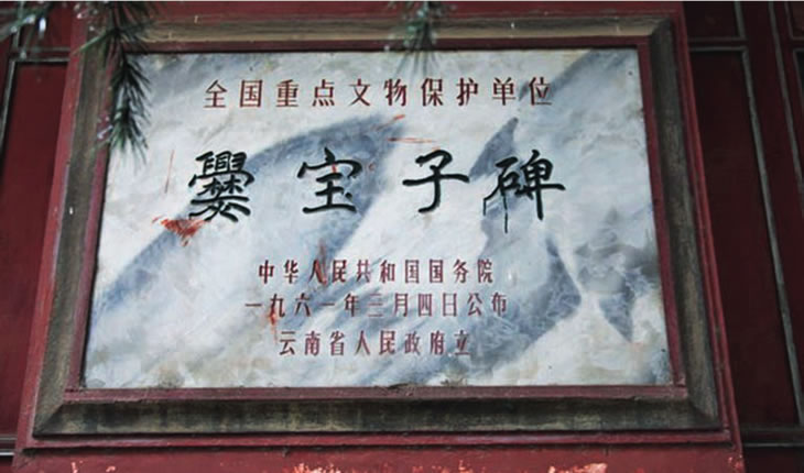 在越州楊旗出土的爨寶子碑全稱(chēng)為“晉故振威將軍建寧太守爨府君墓”碑,立于東晉大亨四年(公元405年)!鹅鄬氉颖肥请`書(shū)向楷書(shū)過(guò)渡的典型碑刻;碑文通篇為六朝時(shí)期的駢文體;也是研究南北朝時(shí)期云南地方史不可多得史料。1961年,國(guó)務(wù)院將其公布為第一批全國(guó)重點(diǎn)文物保護(hù)單位。存于曲靖一中。