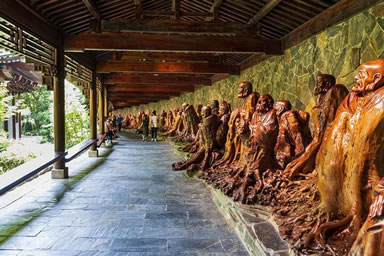 以根雕藝術展現(xiàn)佛教文化的圣地,是由千年樹神匯聚的藝術殿堂,建筑面積1.2萬平方米,縱深有三座大殿,第一幢為雙層結(jié)構(gòu),第二第三幢均為單層結(jié)構(gòu)。兩邊另有羅漢文化長廊依山而建,環(huán)繞其間,有未來佛殿、大雄寶殿、羅漢堂等,陳列有釋迦牟尼、未來佛、四大菩薩、四大天王、五百羅漢等佛教文化系列巨型根雕作品一千余件,其中最大的根雕釋迦牟尼主佛,形體龐大,重達40余噸,根材花巨資,于中緬邊境一路繞道跋涉而來,經(jīng)醉根“點化”,巍然成佛!五百羅漢陣更是氣勢雄偉,長達680余米,整體布局渾厚古雅,堪稱中華一絕、世界之最。
