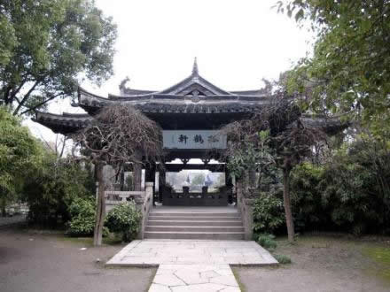 孤鶴軒位于沈園中部,是新辟建園林部分的景觀中心。北臨大荷花池宋池,與東北邊濱水小榭逼遙相對(duì),西邊緊靠六朝井,南邊是遺物壁和明池。軒為單檐歇山頂兩面帶廊的敞廳,平面為倒“凸”字形,寬而臨水。構(gòu)架為仿宋式木構(gòu),下為青石欄板圍起的挑空平臺(tái),造型秀麗曲雅。孤鶴軒亦稱“孤鶴哀鳴”處,是陸放翁的自喻。偉大愛(ài)國(guó)詩(shī)人陸游因南宋朝廷昏庸,壯志難以實(shí)現(xiàn),發(fā)出孤鶴的哀鳴,以孤鶴自喻,隱喻詩(shī)人在人生中痛失伴侶,事業(yè)上報(bào)國(guó)無(wú)門、愛(ài)民有罪、屢遭貶職的坎坷一生。亭內(nèi)有“亭池”遺址,1985年考古發(fā)掘時(shí)在此發(fā)現(xiàn)唐亭閣和明代的假山、魚池遺址!肮满Q軒”匾額分為內(nèi)外兩塊,內(nèi)匾額由著名書畫家、文物鑒定家謝稚柳題寫,亭外由大康敬書。