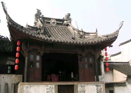 修真觀古戲臺是道觀的附屬建筑,建于清乾隆十四年(1749),與修真觀一樣屢遭毀損,但民國八年(1919)年修繕后,便一直保持至今。戲臺占地204平方米,北隔觀前街與修真觀相對,南臨東市河,東倚興華橋。戲臺為歇山式屋頂,飛檐翹角,莊重中透著秀逸。梁柱之間的雀替均為精致的木雕,藝術(shù)價值極高。臺為兩層,底層用磚石圍砌 ,進出有邊門和前門。邊門通河埠,底層后部有小梯通樓臺,亦可通過翻板門從河埠下到船里。樓臺分前后兩部分,后部是化妝室,雕花矮窗,寬敞明亮;前部是戲臺,正對廣場。