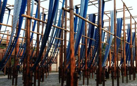 草本染色作坊是手工環(huán)保印染晾曬大型工坊。曬布場地以青磚鋪就,豎立著密密麻麻的高桿和階梯式曬布架,規(guī)模相當龐大。草木本色染坊除了以藍草為原料漿染制作藍印花布工藝外,還有獨特的彩烤工藝流程。彩烤色彩豐富,是從當?shù)氐牟菽驹现刑崛〉,像茶葉、桑樹皮、烏桕樹葉都是提取色彩的原料,所以這個染坊在當?shù)亟凶霾菽颈旧痉弧?
