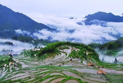 乍看似無序的曲線,在眩目的平臺狂歡,扭動的身姿沒有雷同的,田塊的形狀沒有相似的,草色花色水色天色沒有凝固的,景隨步移沒有不變的,泥房炊煙、耕牛犁田、牧童短笛沒有靜止的……,畬漢兩族農(nóng)人,千年生命接力,用一種筑田岸、鏟田坎的古老技術(shù),向大自然求愛,創(chuàng)造云和古老的童話世界。這就是云和梯田——中國最美梯田。