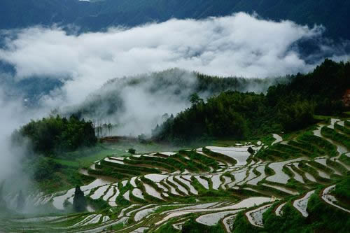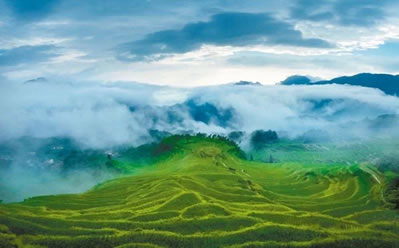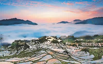 是梯田,是濕地,是澤國,形成亦山亦水的奇觀,來源于森林腹地恒久的涵養(yǎng)補給,只見云水天來,不見旱澇來襲。雨云象俏皮的村姑,出沒無定、行蹤無定,著裝無定,心情無定……忽而為項頸之哈達,忽而為足下之地毯,忽而為纏腰之彩帶,親親云朵,感悟創(chuàng)意。這就是云和梯田——沉浮著的云水世界。