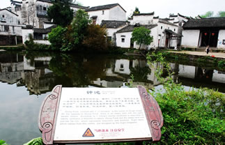 鐘池位于諸葛村的中心,在大公堂正前面,面積0.24公頃,它的邊上是一塊與它逆對(duì)稱(chēng)面積的陸地,村民用以曬場(chǎng)之用。易經(jīng)上說(shuō)“東南為陽(yáng)、西北為陰”再加上“天圓地方”之說(shuō),空地和鐘池正呈陰陽(yáng)太極圖形。陸地靠北和鐘池靠南各有一顆水井,正是太極中的魚(yú)眼。鐘池的南岸是一個(gè)陡坡,順著陡坡而建的幾幢大房子從北岸望去一幢比一幢高,加上前面貼水一溜小平房,跌宕起伏,輪廓線大起大落,景象峭拔而優(yōu)美。
