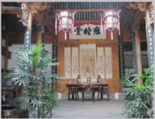 鐘池四周伸展出八條小巷,特點(diǎn)各個(gè)不同,形成了坎、艮、震、巽、離、坤、兌、乾八個(gè)部位。大公堂就在它的坎宮部位,從它的正門(mén)邊上東而去的一條十分幽深,一層層的臺(tái)階上坡,左側(cè)是綠蔭如蓋的園子,的一右側(cè)是一排排住宅的后墻,這條巷是通往村中十八廳堂之一的積慶堂的。鐘池東面條巷子很平直,100米長(zhǎng)。八條小巷似通卻閉,似連卻斷,虛虛實(shí)實(shí),猶如一張蜘蛛網(wǎng),又宛如一座迷宮。